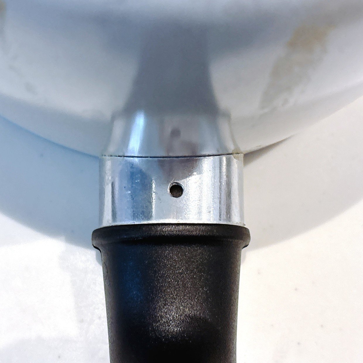 この穴には、ハンドルの中に入り込んだ水や空気を抜く役割があります。ハンドル内で水や空気が膨張すると、フライパンが劣化してしまいます。また、ハンドルの中に水が残ったままだと、部品が腐食するおそれがあります。