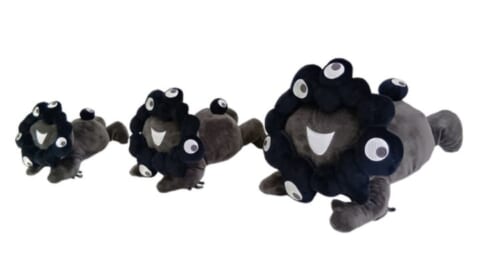 今回登場する黒ミャクミャクのぬいぐるみは、「お手玉風ぬいぐるみ」「這型ぬいぐるみ」「全身ぬいぐるみポーチ」の3タイプ、計7種類が展開されます。それぞれの商品の特徴とサイズ、価格についてご紹介します。