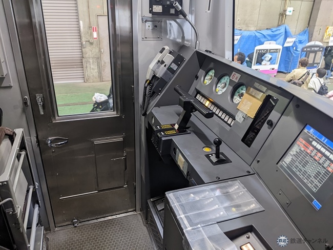 サンクスフェスタに戻って、会場に体験用車両として展示されていたのは80000形電車。前後の先頭車両が開放され、先頭車では運転台での撮影体験、後方車両では車掌放送体験と、鉄道イベントでの定番の催しが用意されました。