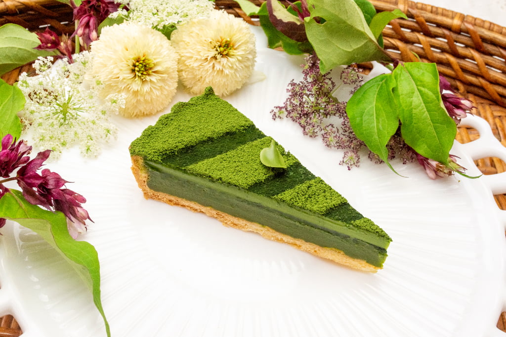 「京都府宇治市産 “辻喜”抹茶のテリーヌのタルト」は、京都を代表する品種「さみどり」の品質の良い覆い下1番茶のみを厳選した茶道用抹茶を使用。なめらかな抹茶テリーヌ生地に、抹茶ソースと抹茶ガナッシュを重ねています。また、抹茶クラムと抹茶パウダーでどこまでも続く雄大な茶畑の情景を表現しています。