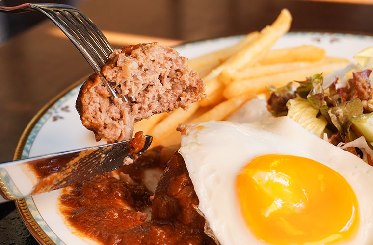 合挽きミンチを使ったジューシーなハンバーグに、ソースをたっぷりとかけて。その上に半熟の目玉焼きをのせれば、見るだけで食欲をそそる“ご褒美ランチ”の完成。濃厚でコク深い味わいが口いっぱいに広がり、思わず心を奪われます。