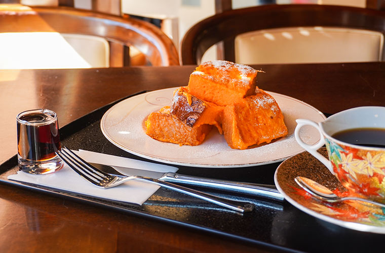 優雅に休日の朝を迎えたいときは、“黄金”と称する極厚のフレンチトーストを。オレンジ色に輝くその姿は、まるで朝陽のようにまぶしく、見ているだけで元気がもらえそうです。