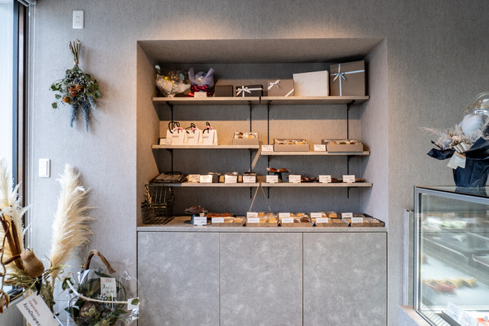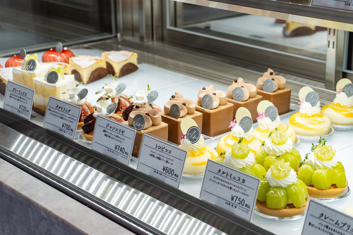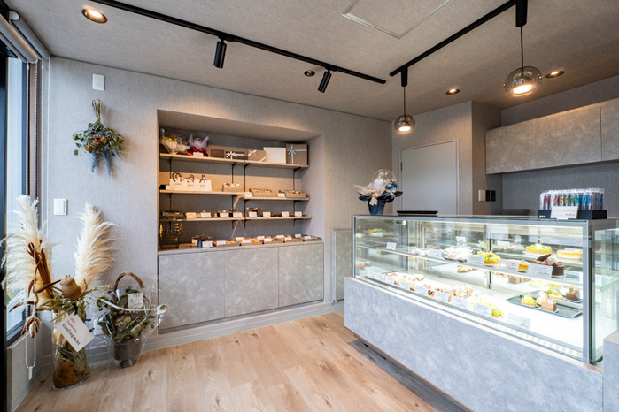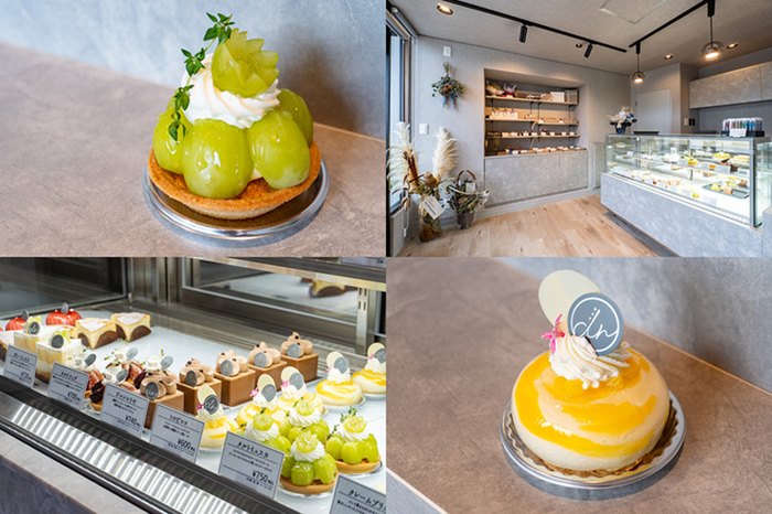 グレーを基調としたおしゃれで洗練された店内では、季節のフルーツをふんだんに使用したケーキやシュークリーム、マカロンなど10種類以上のラインナップがお出迎え!