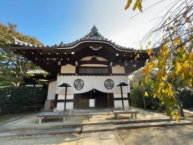 こちらも京都駅から徒歩圏内の東山七条、西向いには三十三間堂がある浄土真宗遣迎院派の寺院『養源院』。豊臣秀吉の側室・淀殿が父・浅井長政の菩提を弔うために建立。本堂には伏見城の遺構が移築され、廊下の天井には伏見城の戦いで自刃した武将たちの血痕が残る天井板を使用することから、通称『血天井』と呼ばれ有名。特に石畳の緩い傾斜の参道の紅葉が見事で、画になる光景。
