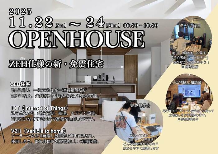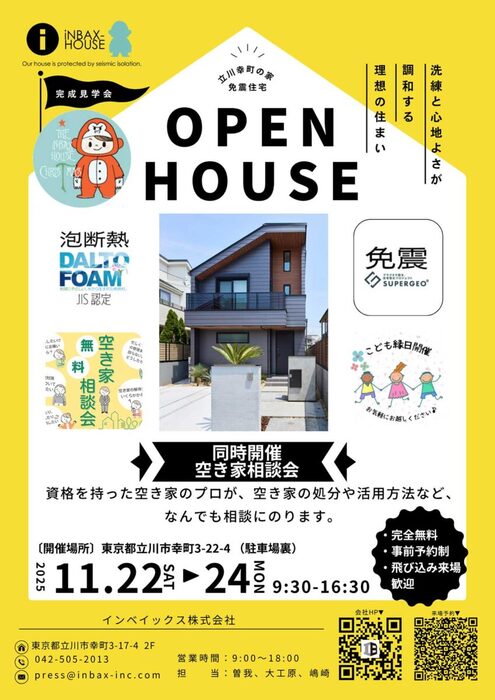 【無料】11月22日(土)~24日(月・祝)開催!立川を中心に『新・免震工法(スーパージオ工法)』を用いた住宅を展開するインベイックス株式会社がオープンハウスを開催