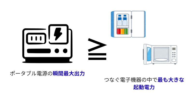 ポータブル電源購入時には「瞬間最大出力」という項目を確認し、これが使いたい機器の起動電力以上となっているかをチェックしてください。
