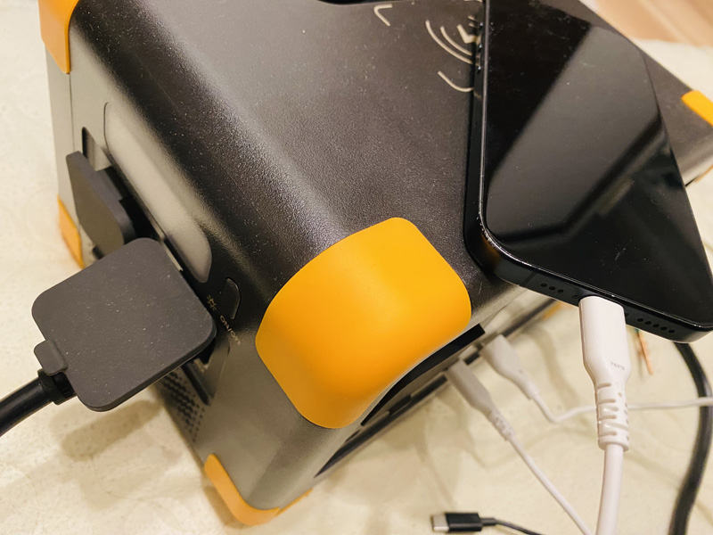 1つ目のポイントは、パススルー充電に対応していることです。パススルー充電とは、ポータブル電源を充電しながら、接続した他機器への給電が可能となる機能です。ポータブル電源は蓄電して使うものなので、緊急時に使うためには基本的に、常にフル充電を維持しておかなければなりません。
