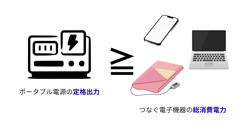 ポータブル電源を利用するには、接続する電子機器の総消費電力が、ポータブル電源の定格出力以下でなければなりません。
