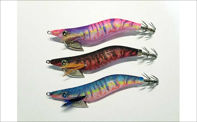 秋に使うエギは3号(9cm)と2.5号(7.5cm)。イカが普段食べている7~9cmほどの小魚(ベイト)と同じ大きさを選んであげるとよい。まずはアピール力のある3号を投げてイカを寄せる。アタリがあったり追尾してきても釣れない場合は2.5号に替えよう。