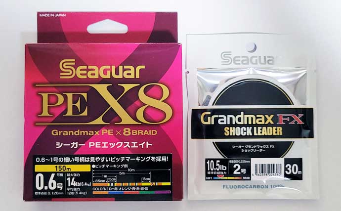 ラインは飛距離がでて感度がよいPEラインの0.6号。リーダーは根ズレに強いフロロカーボンラインの2号でPEラインの先にリーダー1mをFGノットで結節する。細いイトに慣れていない人はPEライン0.8号にリーダー2.5号など春に使う少し太いイトでも問題ない。