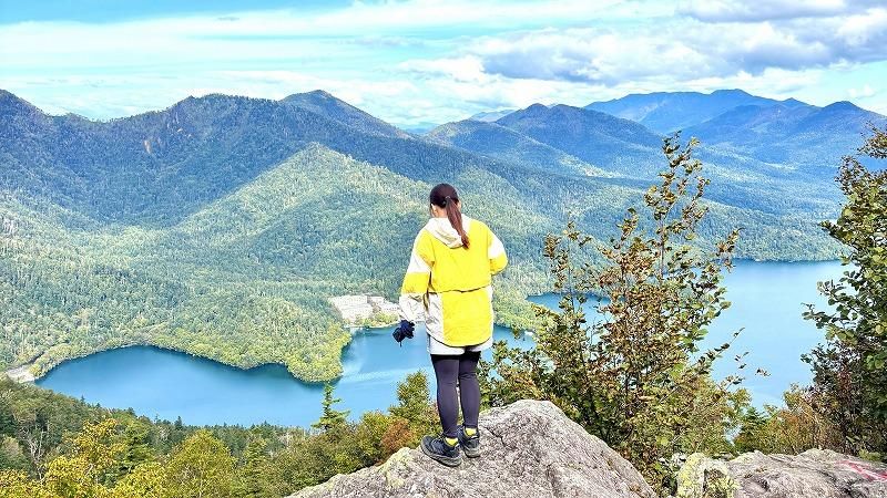 山頂からは青い空が鏡のようにきれいに映る然別湖を一望できます。