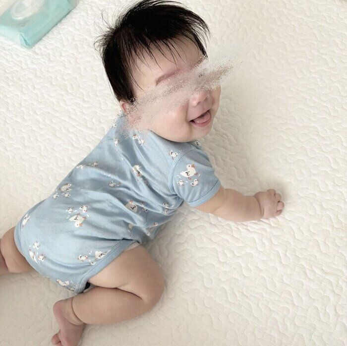 Mさんは、こちらのボディスーツを購入。ハイハイなど、アクティブな動きをする赤ちゃんにも動きやすそうな作りですよね。むちむちボディにもほどよいフィット感で、伸びが良く着心地も◎。まだ暑さが残る日なら、一枚で過ごせてラクですよね。