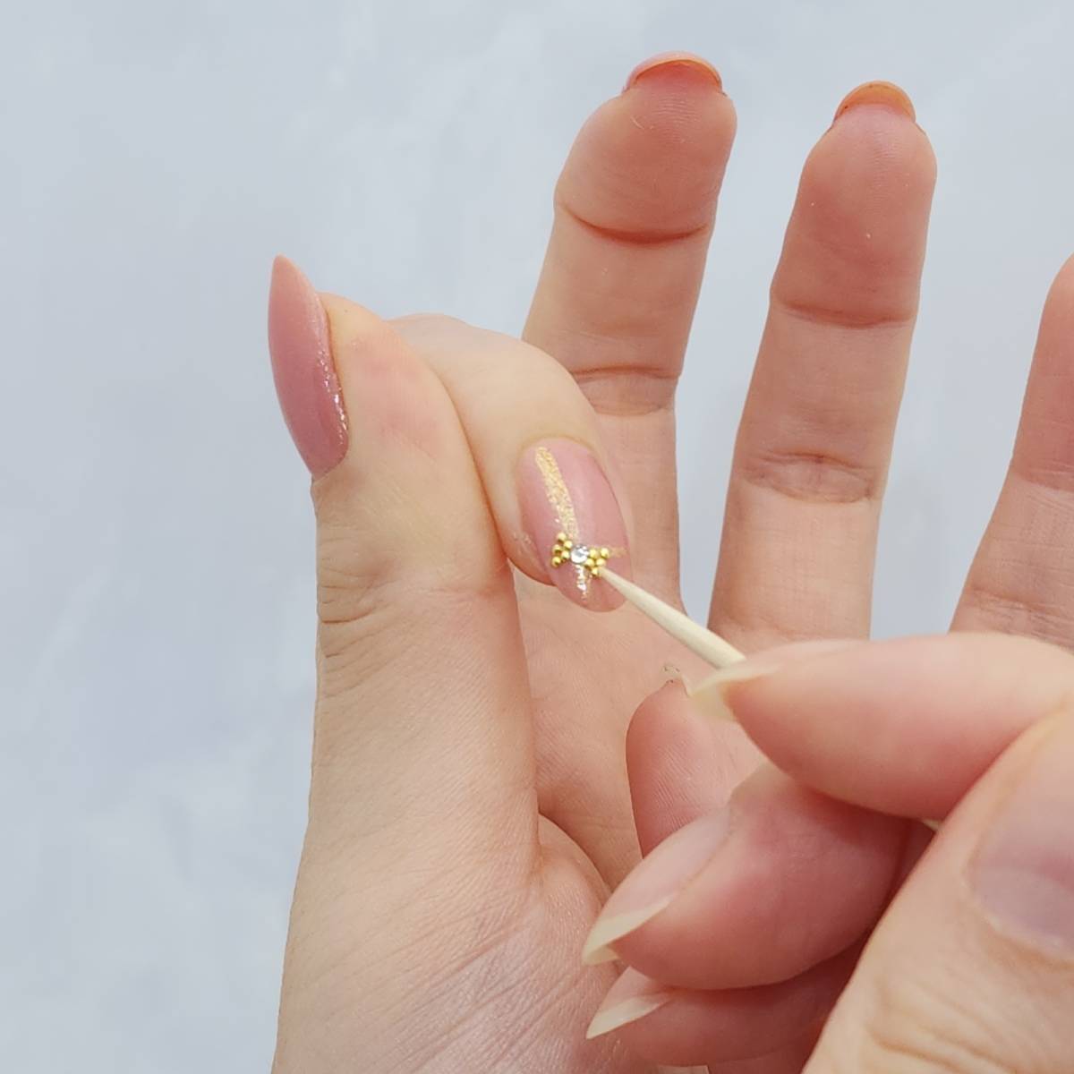 小さいつぶつぶは、ピンセットではつまみにくいので、つまようじの先にベースコートを付けると取りやすいですよ。