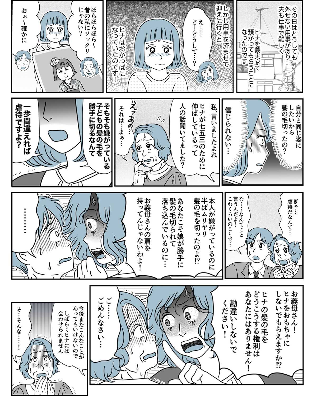 外せない用事があり、娘のヒナ(仮名)ちゃんを義実家に預けたアヤ(仮名)さん。お迎えに行くと、ヒナちゃんは七五三のためにせっかく伸ばしていた長い髪をおかっぱにし、泣き腫らした顔をしていたのです。