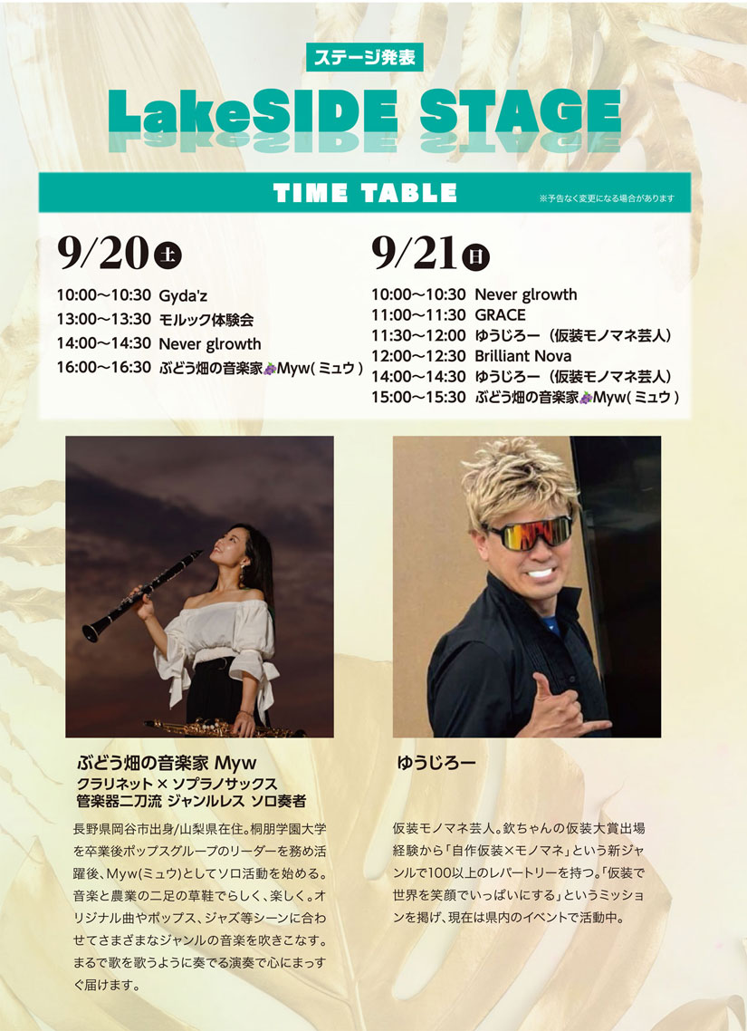 また、同会場では『LakeSIDE STAGE(レイクサイドステージ)』と称し、音楽や仮装モノマネなどのステージも繰り広げられますよ。