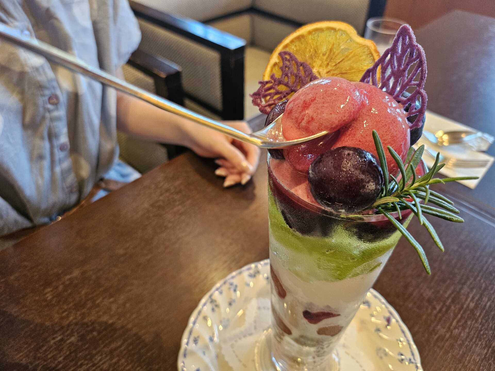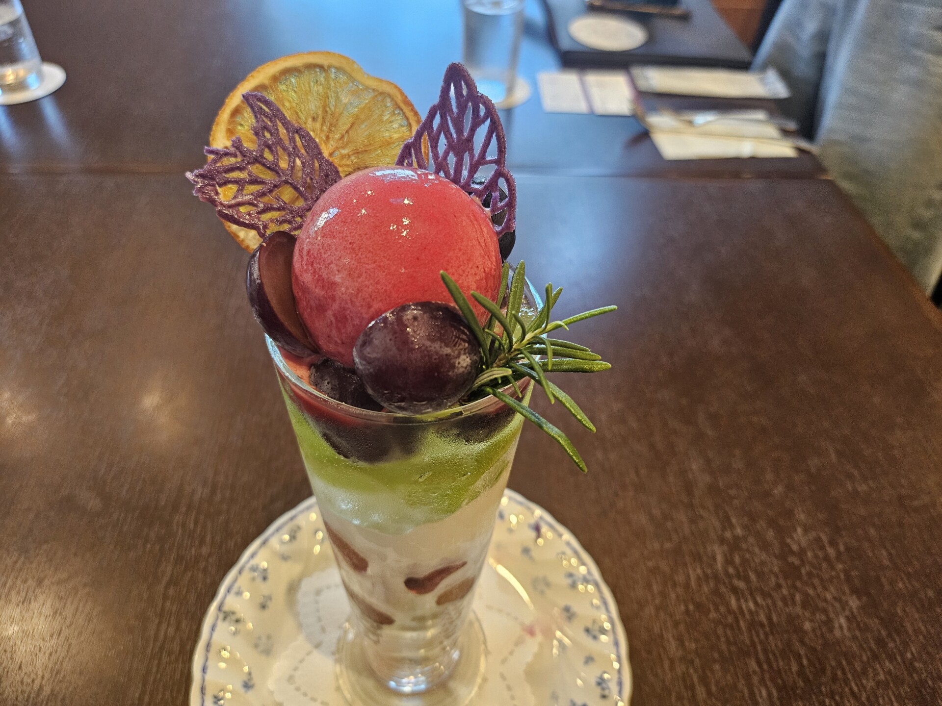 私が訪れた2025年9月には、柑橘チップ、カシスソルべ、フレッシュピオーネ、白ぶどうジュレ、ホイップクリーム、白ぶどうコンポート、ココアのクランブル、鳥取県産「星空舞」のポン菓子が使用されたパフェが提供されていました。