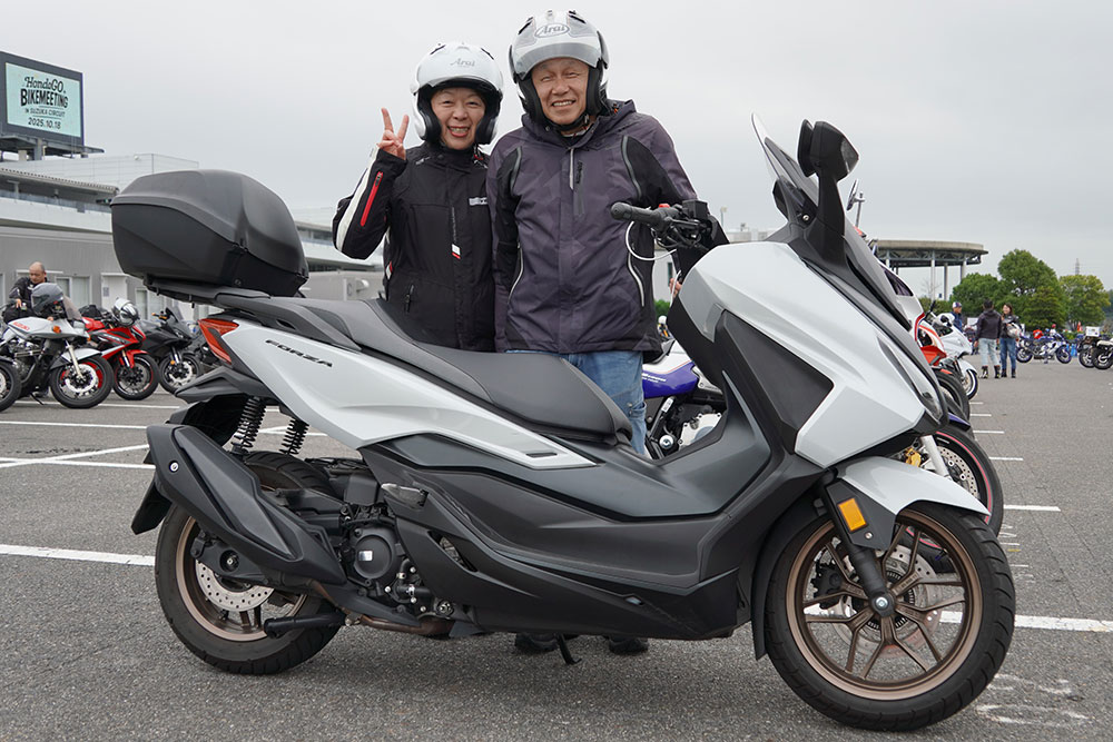 「2023年の初開催以来、2回目の参加です。前回と同様、タンデムでのサーキットツーリングを楽しませてもらいました。今年2月に『フュージョン』から最新のフォルツァに乗り換えたのですが、エンジンはパワフルで、ブレーキング性能も高く、さらに足つきも良いと、大満足の一台です。普段は主に通勤で利用していて、ツーリングも楽しんでいます。来年も鈴鹿開催だったら絶対に参加します!」