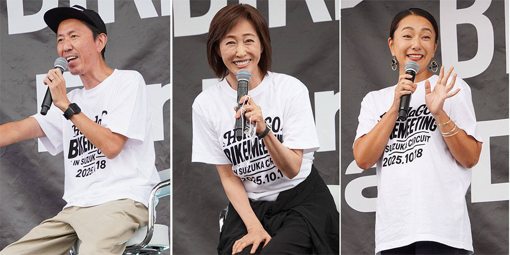 続いてのトークショーでは、芸能界きってのMotoGPファンとして知られるお笑いコンビ「チュートリアル」の福田 充徳さん、女優の高島 礼子さん、タレントの三船 美佳さんら、バイクを愛する著名人が登壇。バイクに乗るようになったきっかけや、来場したライダーへの想いなどを語りました。