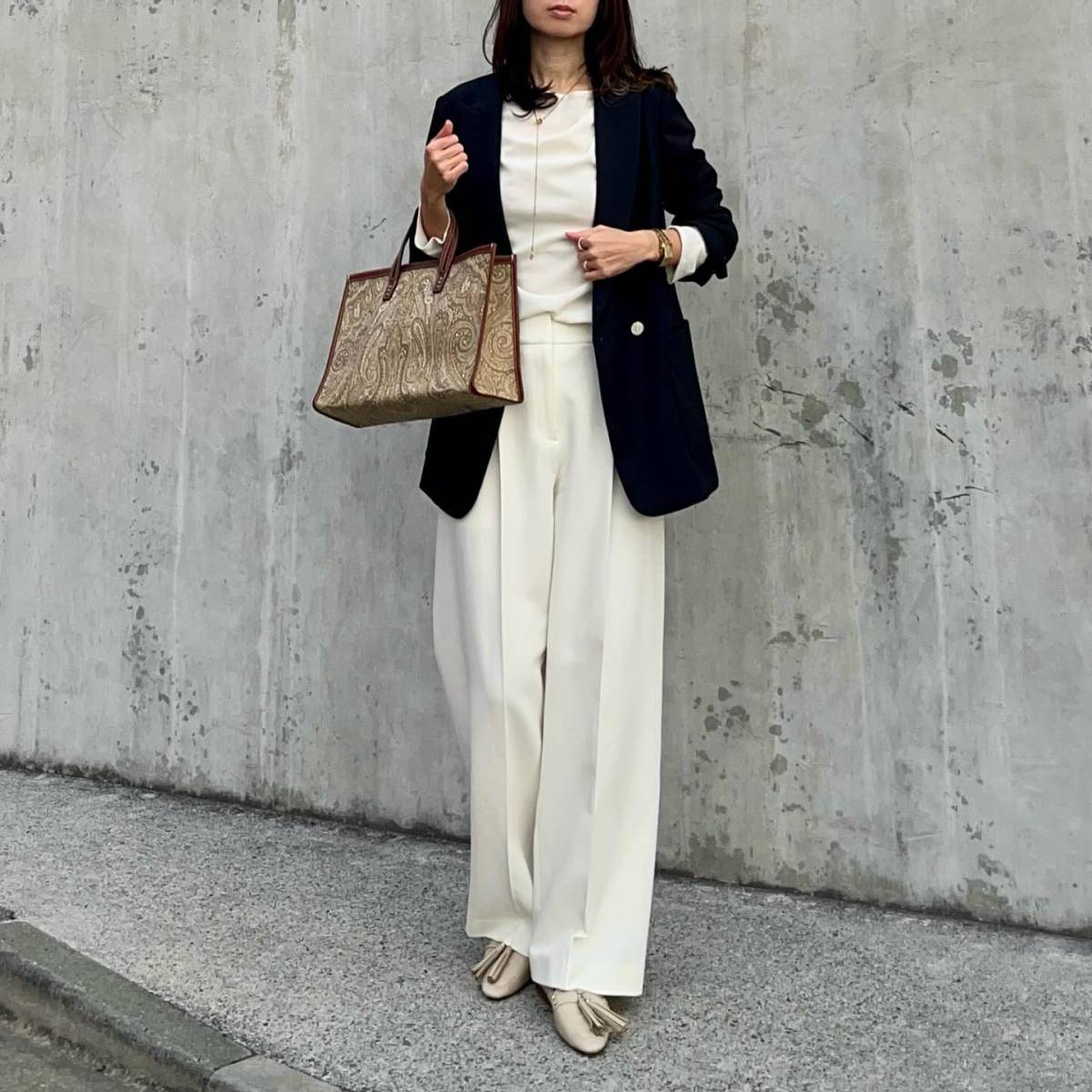 白トップス×白パンツのホワイトコーデにネイビーのジャケットを羽織ると、センスがよく周りと差が付きます♪