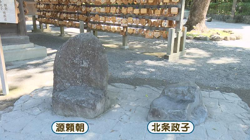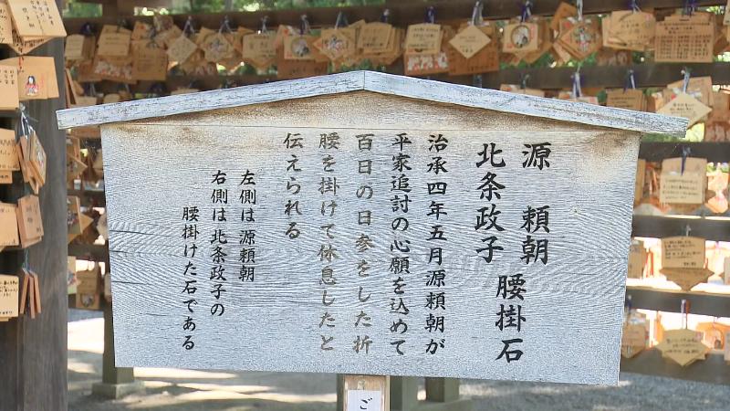 境内を歩いていると、頼朝が百日祈願をした際に、従者の安達藤九郎盛永が控えていた松があったり、源頼朝が腰掛けたと伝わる「腰掛石」があったり。