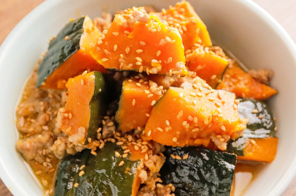 ③ ①のかぼちゃを②に加えて軽く煮からめる。全体にとろみがついたら火を止め、器に盛り付けて白いりごまを振ったら、完成!