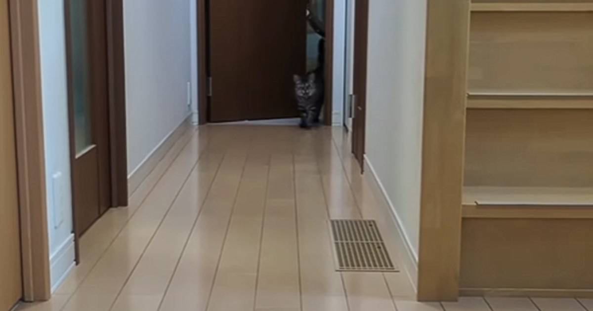 そんななつちゃんは、ママさんが帰宅するとき、とあるお出迎え方法で、ママさんの疲れを癒してくれるのだそう。なんとなつちゃんは、ママさんの帰宅を察した途端、するっとドアの向こうから姿をあらわして、「にゃにゃにゃにゃ」と弾むような声を上げながら、小走りでママさんの元へと一直線。
