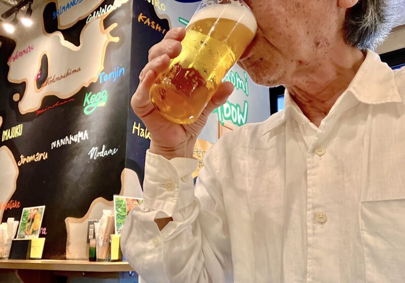 「暑い、暑い」と言うのにも飽きた今年の夏。ならば、酷暑を受けとめた上でグッと堪え、「神様が与えてくれた、生ビールを美味しく飲むのに最高の気候」と考えてはどうだろうか? いわゆる逆転の発想というやつで、そうでもなければ猛暑日に働くモチベーションが沸かないじゃないですか。そんな言い訳を考えながら、17時の開店を目指して警固小学校の向かいにある「たちのみエルボー」に飛び込んだ。