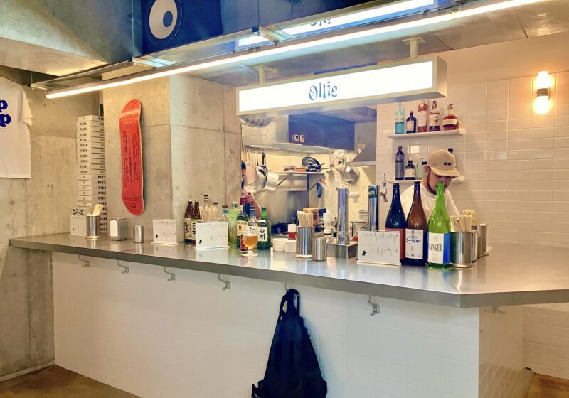 次に向かったのは、警固本通りで6月にオープンしたニューカマーの「オーリー」。店内に入るとヒゲのスタッフ2人組が明るく迎えてくれた。コンクリート打ちっぱなしの空間にセンスのいいBGMが流れる店内は、さながらスタンディングバーといった趣きだ。