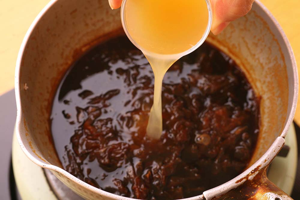 鍋から立ち上るアルコールの匂いが消えたら、蒸発した分だけ水を注ぐ。