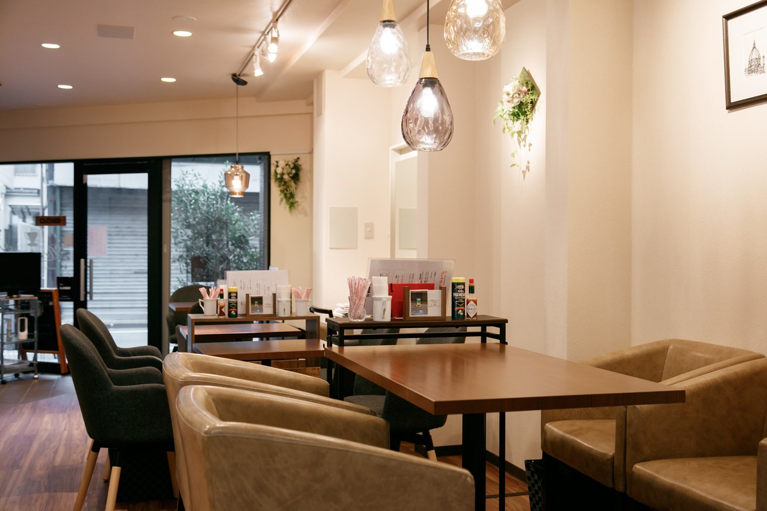 先生はお店に来てくださって、私がやるのをじっと見てて「OK」と言ってくださって。それからスタートしたんです。今もですけど、コーヒー豆とか、必要なものはお教室からの紹介。でも、なにしろ銀座でしょう。お家賃は高かったですよね。5坪ぐらいだったんですけど、ま、コロナもあって、この住吉に越してきた。それが2022年5月。銀座のときはギュッと詰まっていたけれど、ここは24坪ぐらいあるから、テーブルとかもゆったり配置できてます。