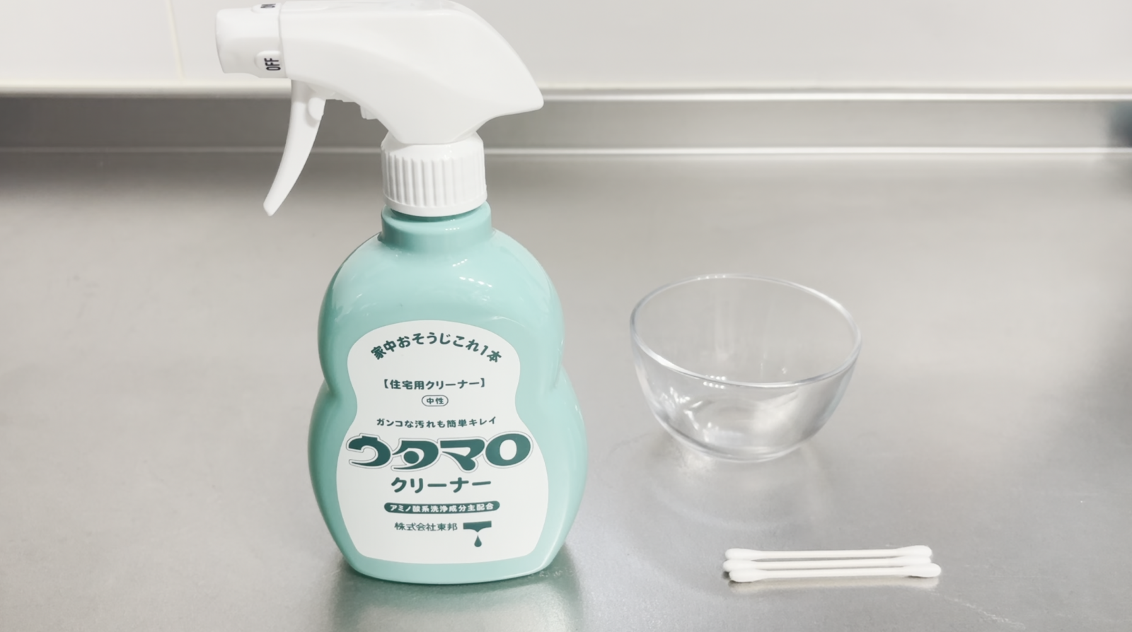 水で湿らせた綿棒で残った洗剤を丁寧に拭き取ります。洗剤が残るとベタつきや変色の原因になるため、しっかり落としましょう。