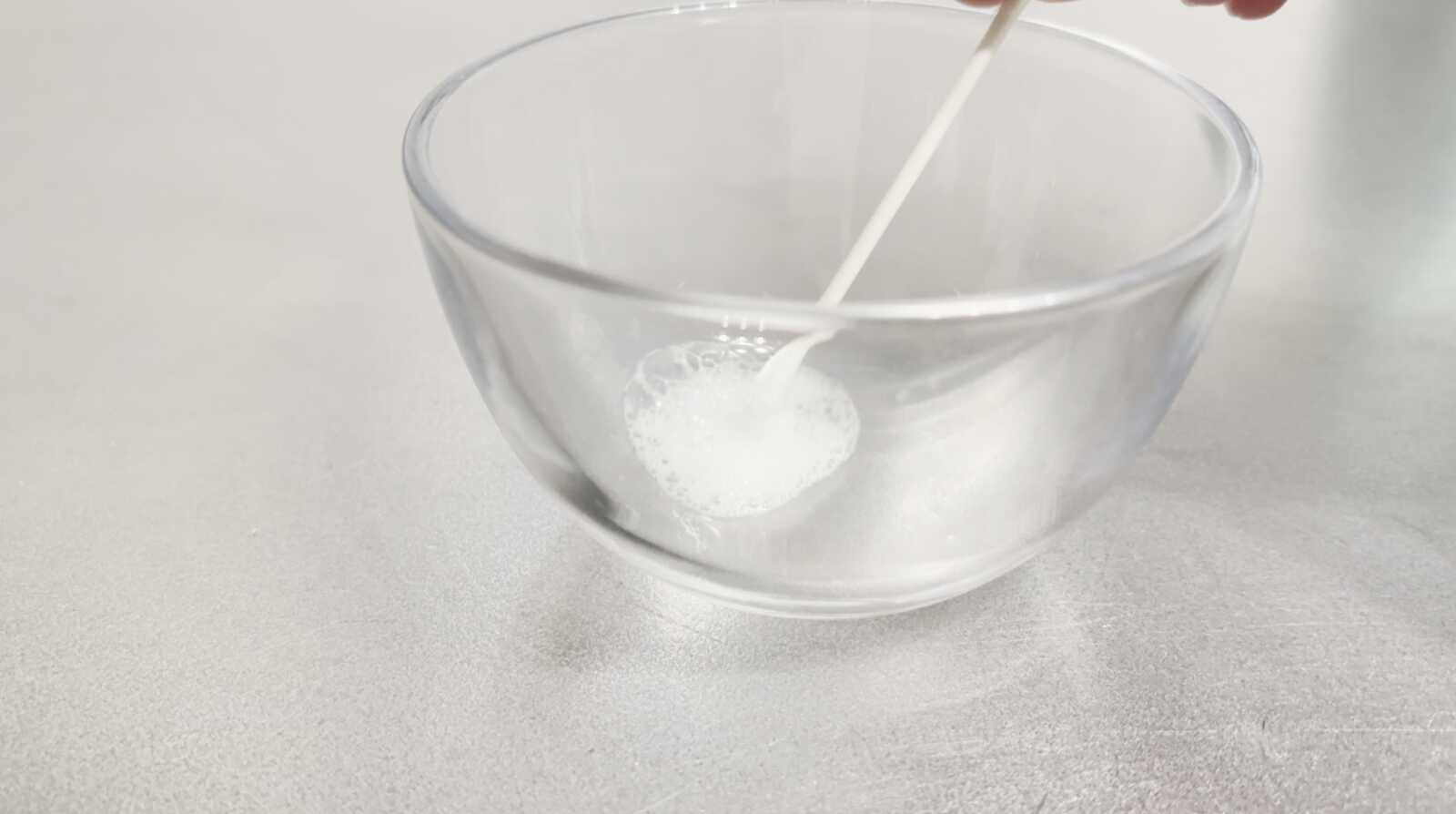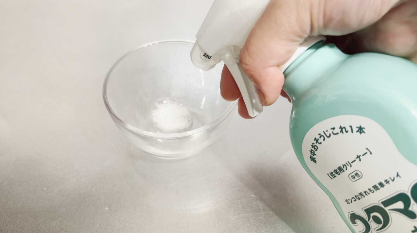 ウタマロクリーナーを小さな器にスプレーし、少量出します。スプレーを直接パッキンにかけるより、出し過ぎを防げて安心です。