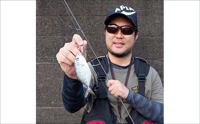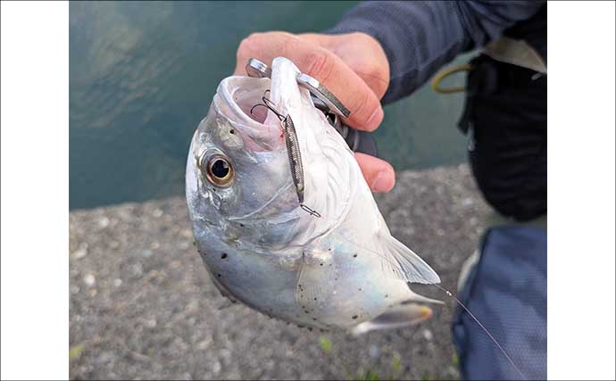 松尾さんの足元を見ると、7~8匹の扁平形の魚が群れている。よく見ると、その側面には黒い斑点。これまた近年増えているニセクロホシフエダイだ。20cm程度だがルアーにも反応が良く、ライトソルトの定番ターゲットになりつつある。