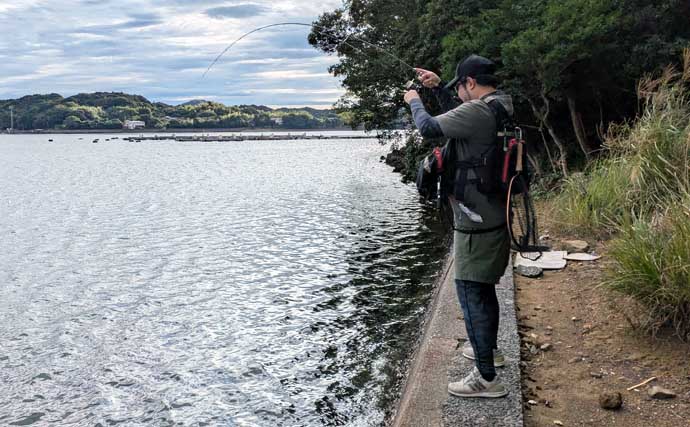 松尾さんがまずセットしたのは、やはりトップウォータープラグ。5cmのペンシルベイトを、広範囲にキャストしてサーチしていく。時折風は吹くものの、水面は穏やかで今にもドカンとメッキが飛び出してきそうなのだが、期待に反して反応は皆無。
