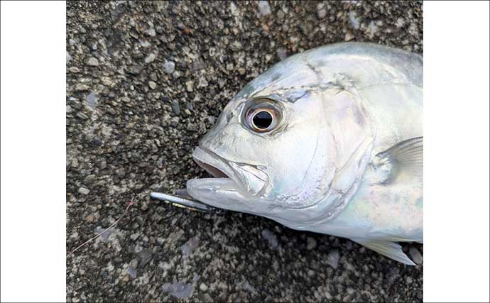 チョンチョンッと誘ってスーッとフォールさせると、一発でヒット。かわいいギンガメアジだ。だがメッキはスレやすい魚。この1匹が告げ口したのか、すぐに反応がなくなってしまった。