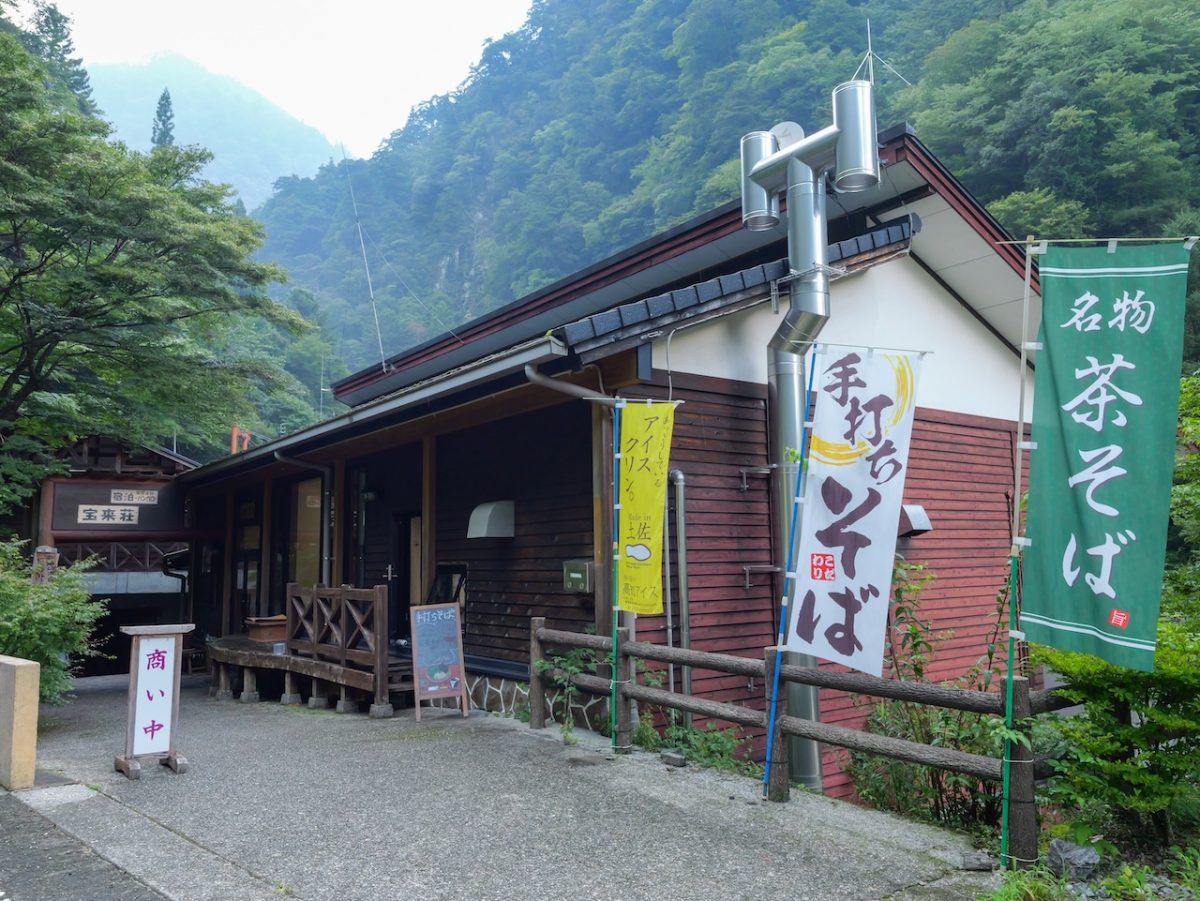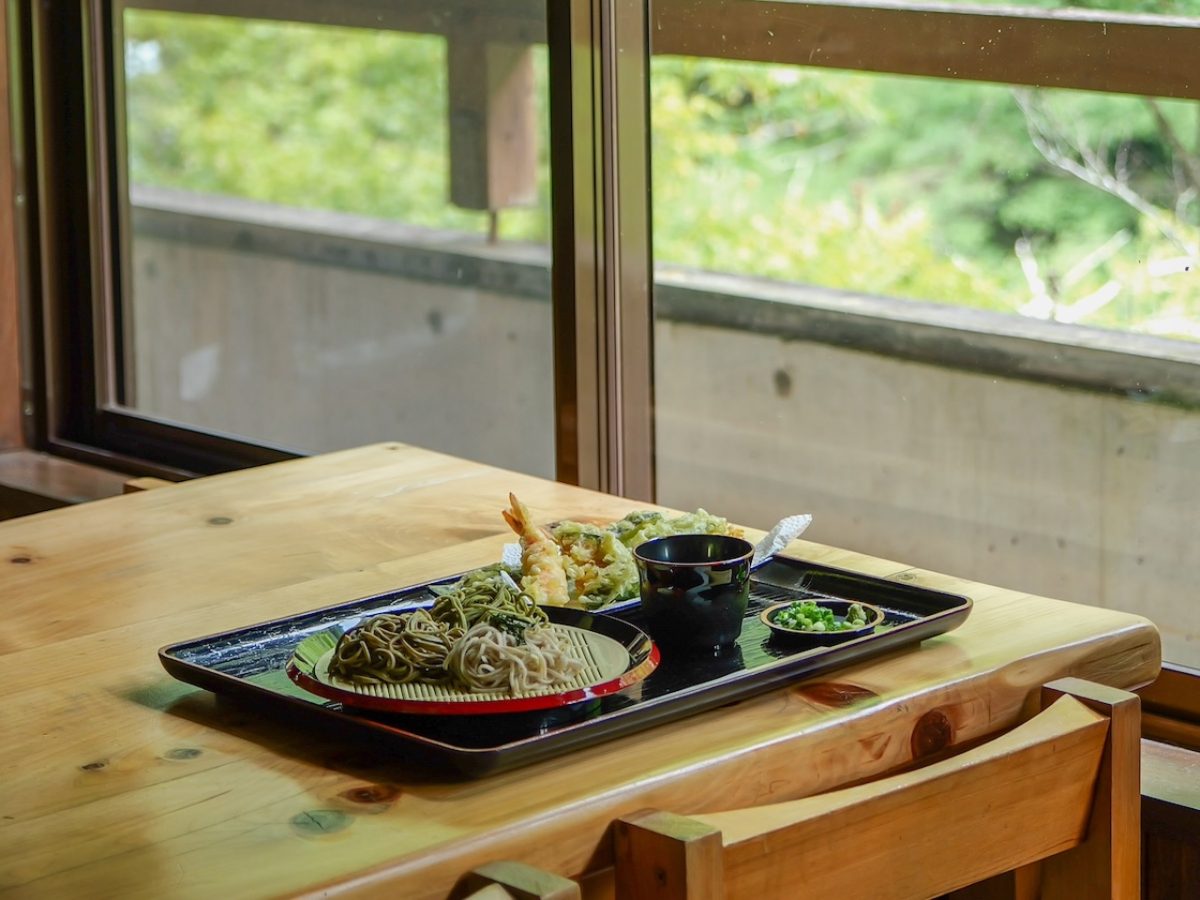 安居渓谷を横目に、蕎麦をすすり、お茶の香りに癒される。そんな贅沢なひと時を楽しめる。