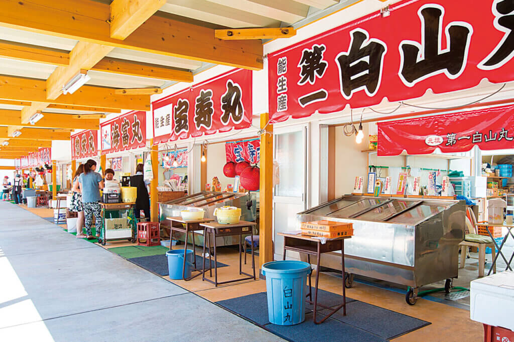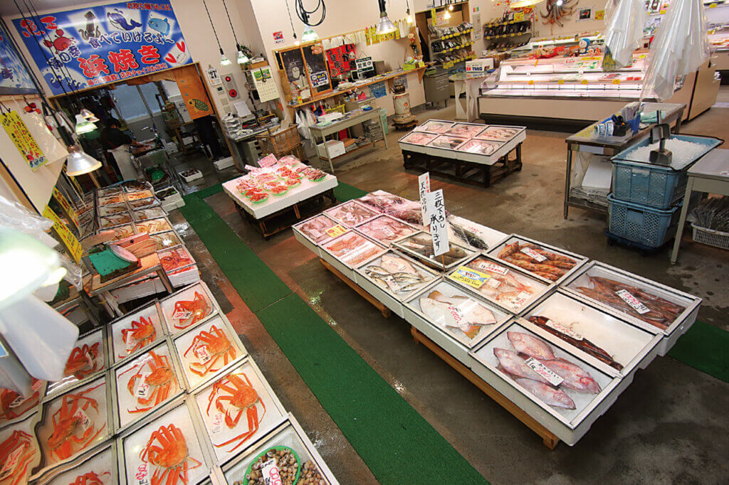 鮮魚センター「魚勢」「磯貝鮮魚店」「日本海 魚正」では新鮮な魚介類が並ぶ。
