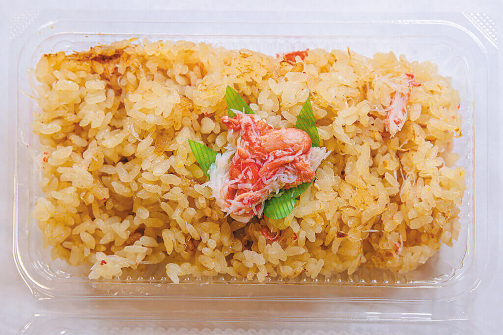 カニ屋横町内にある「小判鮫」では、カニを使った料理をテイクアウトできる。看板はかに飯(500円)。