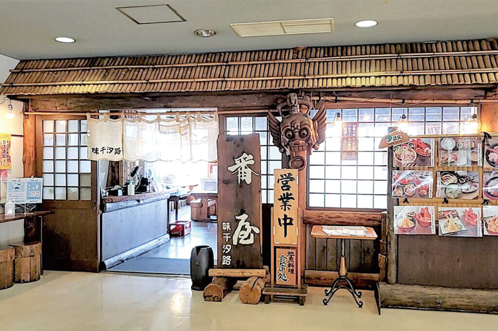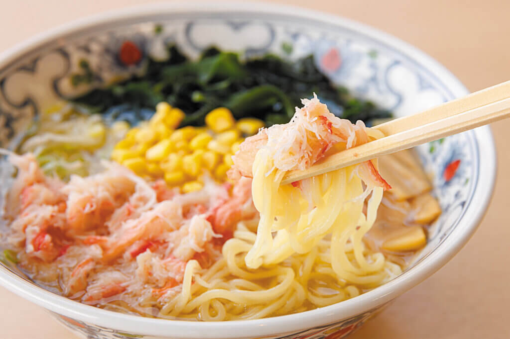 海沿いの道の駅ならではの、新鮮な海の幸を生かしたメニューが人気。なかでも注目は、能生特産のカニの脚の剥き身をふんだんに使った個性あふれるかにラーメン(1,430円)。程良い塩気のあっさりスープが、カニの風味を引き立てる。