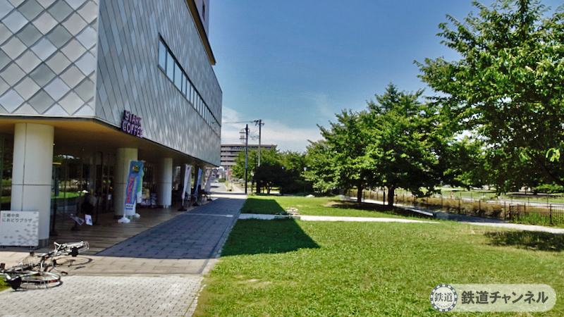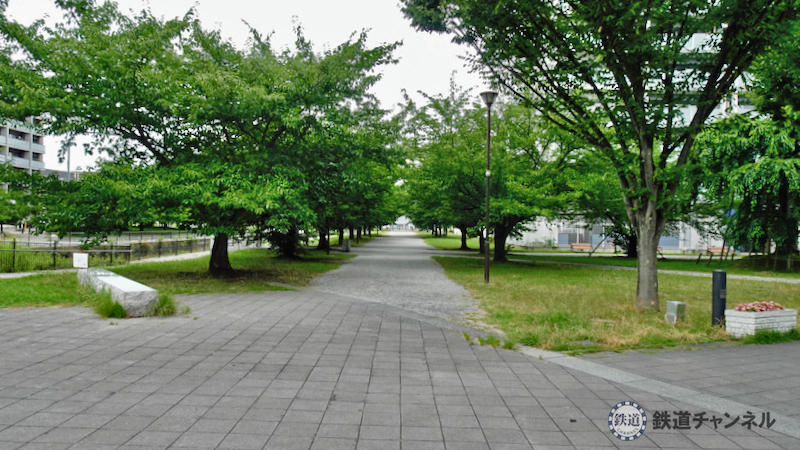 南側には親水広場。奥の高架線はつくばエクスプレスです。