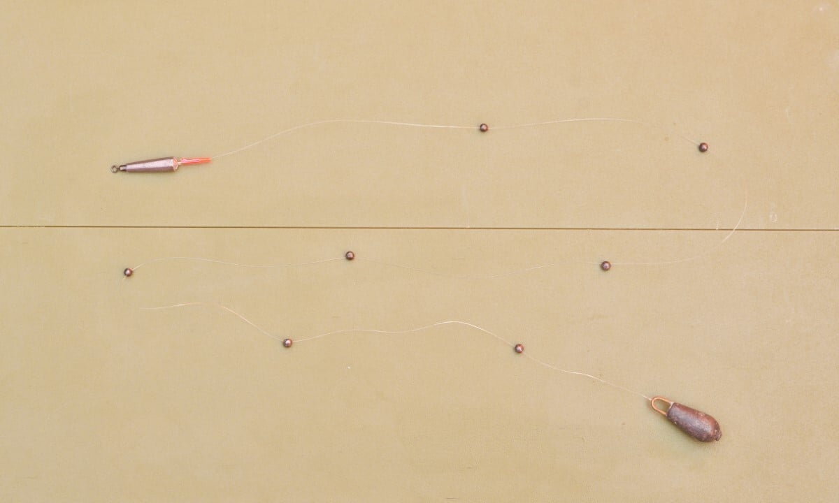 ユニークな捨てオモリ仕掛け。上の本オモリ(左上)は1~2g、下の捨てオモリ(右下)はナス型2~3号。底に這わせるようにすべく、ガン玉5~6号を10cm程度の等間隔で付けるのがミソ。このシステムだと仕掛け投入時、穴に吸い込まれるように落ちていく。沈下スピードが速いうえトラブルも減らせる