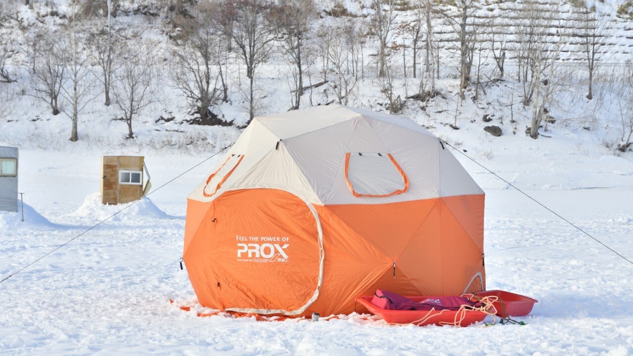 かなやま湖のワカサギ釣りは例年、鹿越大橋の南側から開幕。橋を挟んで東側に第1駐車場、西側に臨時(第2)駐車場が設けられ、その前にテント村ができるのが通例。1月下旬の午前8時過ぎ、二橋さんが選んだのは第1駐車場前だった。ある程度時間をかけてポイントを探索し、同行した友人2人とテントを設営。二橋さんは単独でも釣行するものの、仲間とワイワイやりながら釣るワカサギならではの楽しさを満喫すべく、今季からラージサイズのテントを導入している。