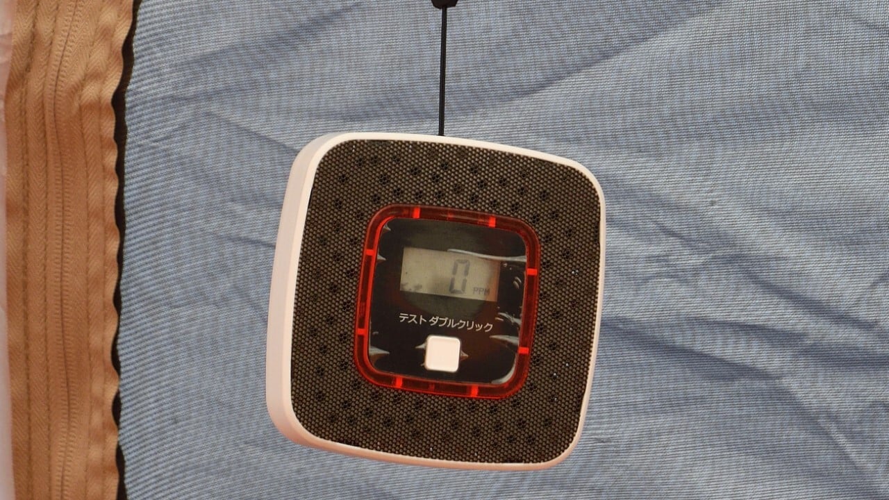 暖房器具はガスストーブを使っているが、当然ながら一酸化炭素警報器は必須アイテム。テント上部の左右に1つずつ付けている