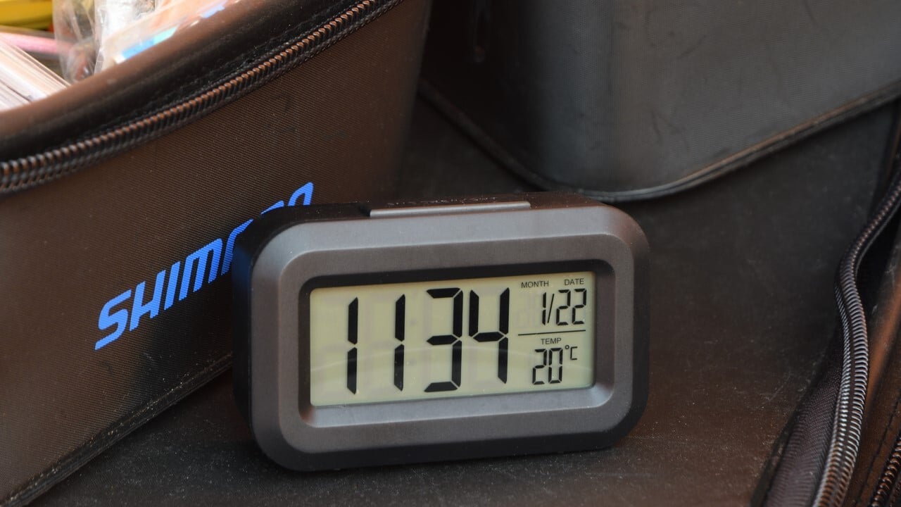 釣り座から見やすい位置にデジタル時計を配置。釣果を伸ばす一番のコツは「マメなエサ替え」にあると言い、10分置きに付け替えることを心がけている