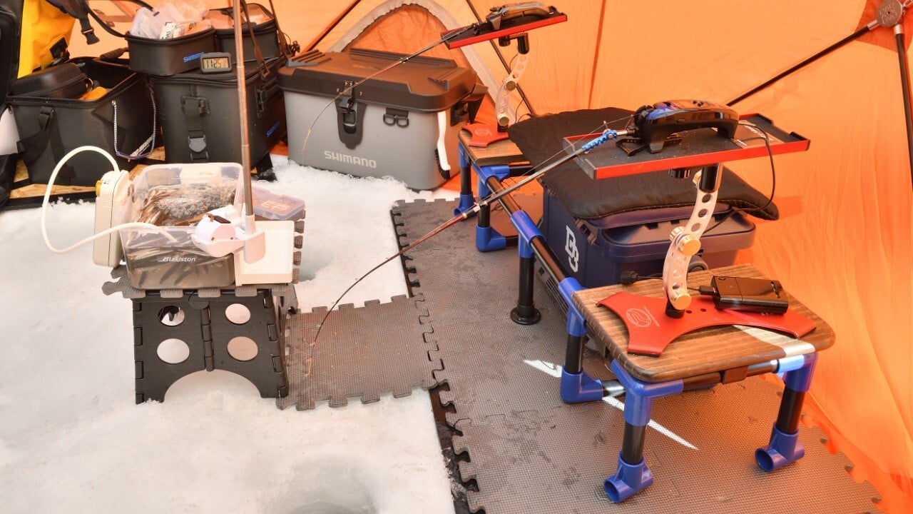 どんな釣り座で楽しむにしても、地面を平らにすることが重要。一番下には耐水性や耐衝撃性が高く、丈夫で床下の下地に用いられるコンパネを敷き、その上に冷気を遮断できるジョイントマット8枚を組み合わせている。そして、脚を置くところにジョインマットを1枚追加し、その先に釣った魚を入れるイケスを配置。フラットで左右均等という理想的な釣り座を完成させると、無駄な動きをすることなく一連の動作をスムーズに行なえるようになり、自ずと釣果は上がってきたという。
