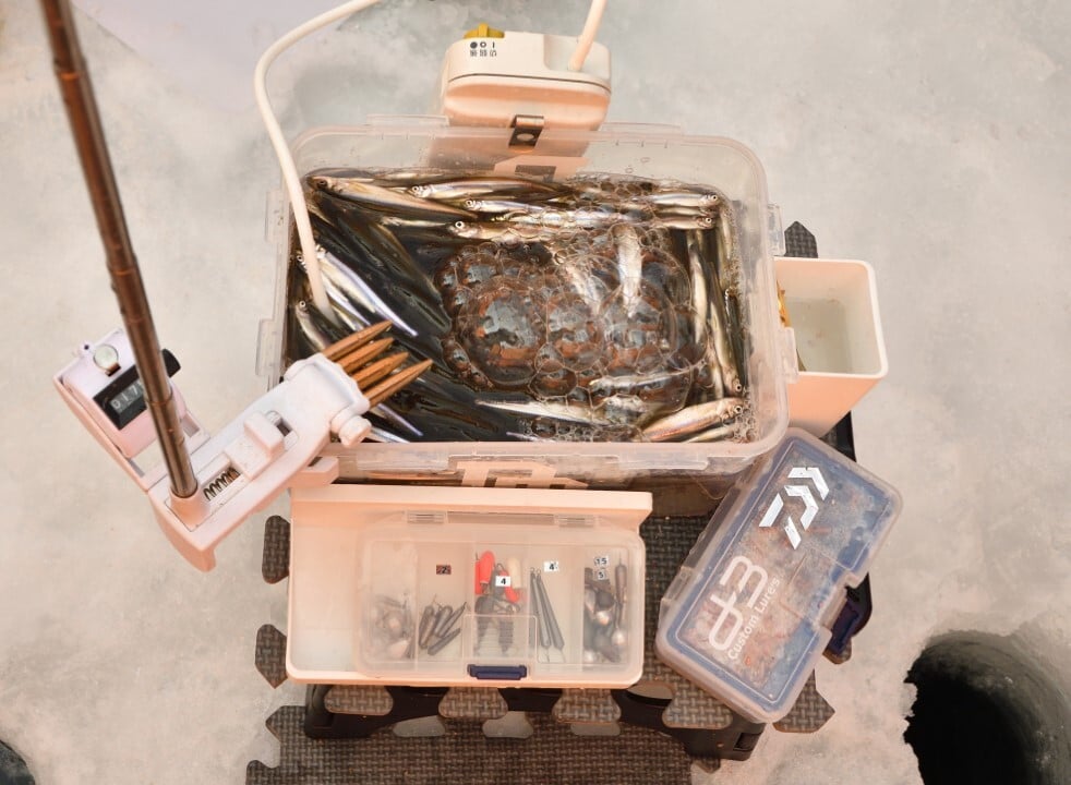 そう話す二橋さんのスタイルは、道内でも一般的になった電動タックルの二刀流。終日快適に釣りを続けられ、かつ手返しをよくすべく、とくにこだわっているのは釣り座だ。当初はあぐら椅子を使っていたが、膝や足が痛いのがネックだった。そこで、オフショアの釣りで一般的な大型タックルボックスに座って釣りをしてみると腰痛対策にもなったが、「どうもしっくりこなくて……」。