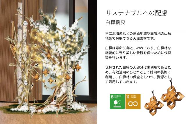 スタッフ手作りの白樺の樹皮を使ったオーナメントも展示され、希望者には手作りキットの販売も予定されています。