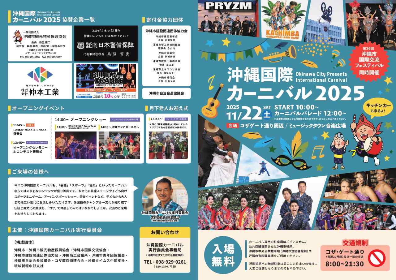 ■日時:2025年11月22日(土) 10:00~20:00 ■会場:コザ・ミュージックタウンおよびコザゲート通り ■行われる主なイベント: ・カーニバルパレート&コンテスト ・沖縄サンバカーニバル ・おきなわ音楽月間 ・第36回 沖縄市国際交流フェスティバル等 ・アーバンスポーツ