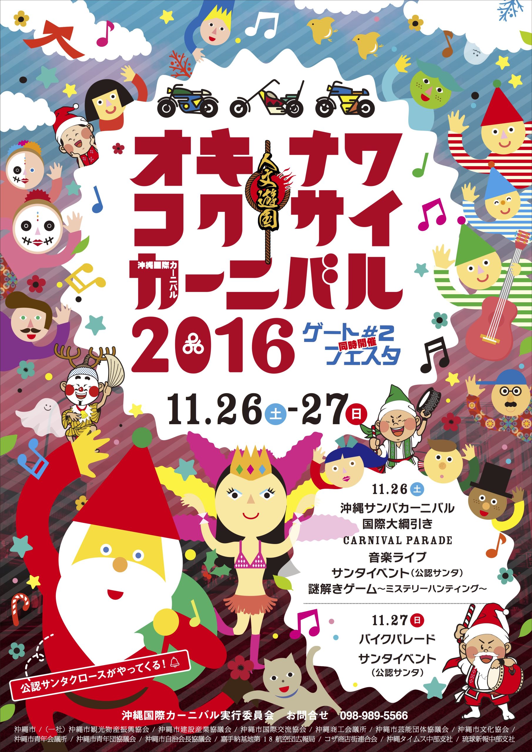 1993年から続く沖縄国際カーニバル。今の形に至るまでに様々な変遷を遂げ、サンバカーニバルを目玉に、音楽ライブや大綱引き、エイサー、バイクパレード等各種強烈な個性を放つパレードが展開されていました。 今も、サンバカーニバルはメインイベントのひとつです。 サンバカーニバル出演者をご紹介します。 何年も本場ブラジルのカーニバルで重要なポジションを務めるSAYURIさん率いるAs Tartaruguinhas。埼玉拠点の活動するサンバチーム、ブロコ埼玉。はじける若さが魅力のVVV(Vida Vira Virou)。沖縄県ブラジル出身者の親睦団体、沖縄ブラジル協会。沖縄市、中央パークアベニュー生まれのサンバチーム、オ・ペイシ・キ・ヒ・ダ・コザ。うちなーぐちうぃ多く交えたテーマソングがキャッチーです。北谷で活動するブラジル伝統、カポエイラのチーム。 2016年のオキナワコサイカーニバルのポスターを見てみましょう。 中央にサンバ。左にサンタ。右はしにエイ坊。サンバダンサーが中央に。尚、エイ坊は沖縄市のエイサーのまち沖縄市をPRする公式キャラクターです。過去のポスターを眺めると、沖縄市の多様性とこのイベントの時代と共に変遷していく様がうかがえます。