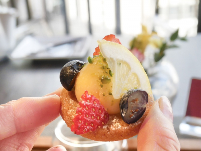 「ミニタルト」は一口サイズながら、しっとりタルト生地にたっぷりフルーツがのった華やかな一品。口に入れると香ばしさとフルーツの甘みが広がります。